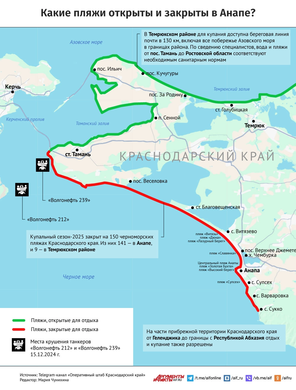В Анапе и других курортах Краснодарского края продолжается ликвидация последствий разлива мазута. Напомним, танкеры «Волгонефть 212» и «Волгонефть 239» потерпели крушение в водах Керченского залива 15 декабря 2024 года, в результате в Черное море попало свыше двух тонн нефтепродуктов. По данным оперативного штаба, со дна замазученный грунт убирают водолазы, а на берегу работает спецтехника. Она многократно просеивает верхние слои, убирает загрязнения, затем переворачивает и просушивает грунт, а после снова просеивает. Таким способом уже было очищено 6,7 км пляжей Анапы. Смотрите в инфографике aif.ru карту чистых зон, а также мест, все еще опасных для купания.