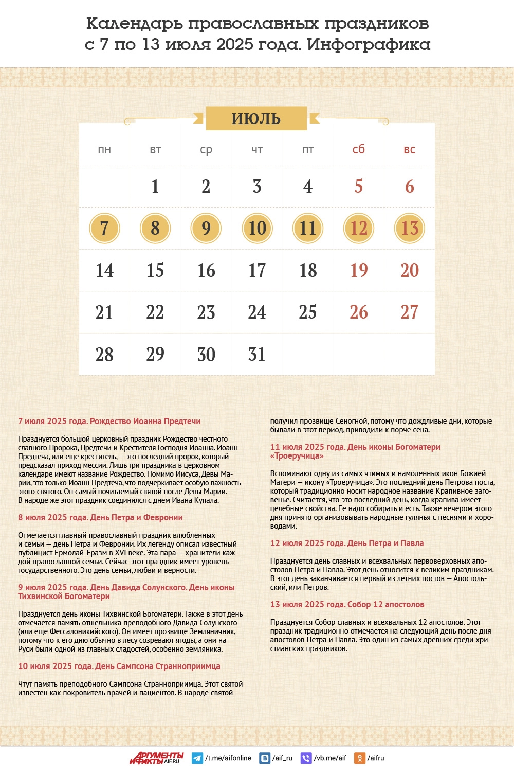 Календарь православных праздников с 7 по 13 июля 2025 года. Инфографика