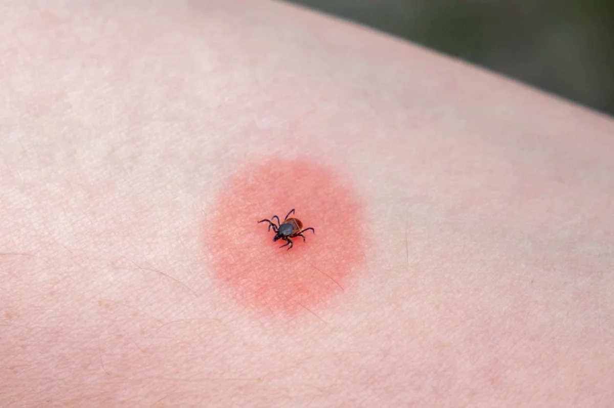 - Появление кольцевидного пятна с бледным центром (эритема) — главный признак болезни Лайма (боррелиоза). Может увеличиваться до 10–20 см в диаметре.