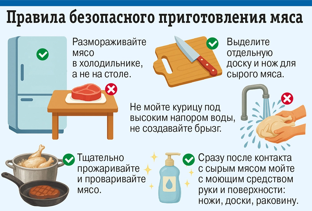 — Прежде всего, следует правильно хранить сырое мясо и птицу — в закрытом контейнере на нижней полке холодильника, чтобы не было соприкосновения с другими продуктами. И размораживайте мясо в холодильнике, а не на столе. Используйте отдельные разделочные доски для сырого и готового. Ведь сальмонелла может обосноваться не только на продуктах, но и на поверхностях, если они контактировали с сырым мясом. Тщательно мойте руки после контакта с сырым мясом и яйцами, а также ножи, раковину.